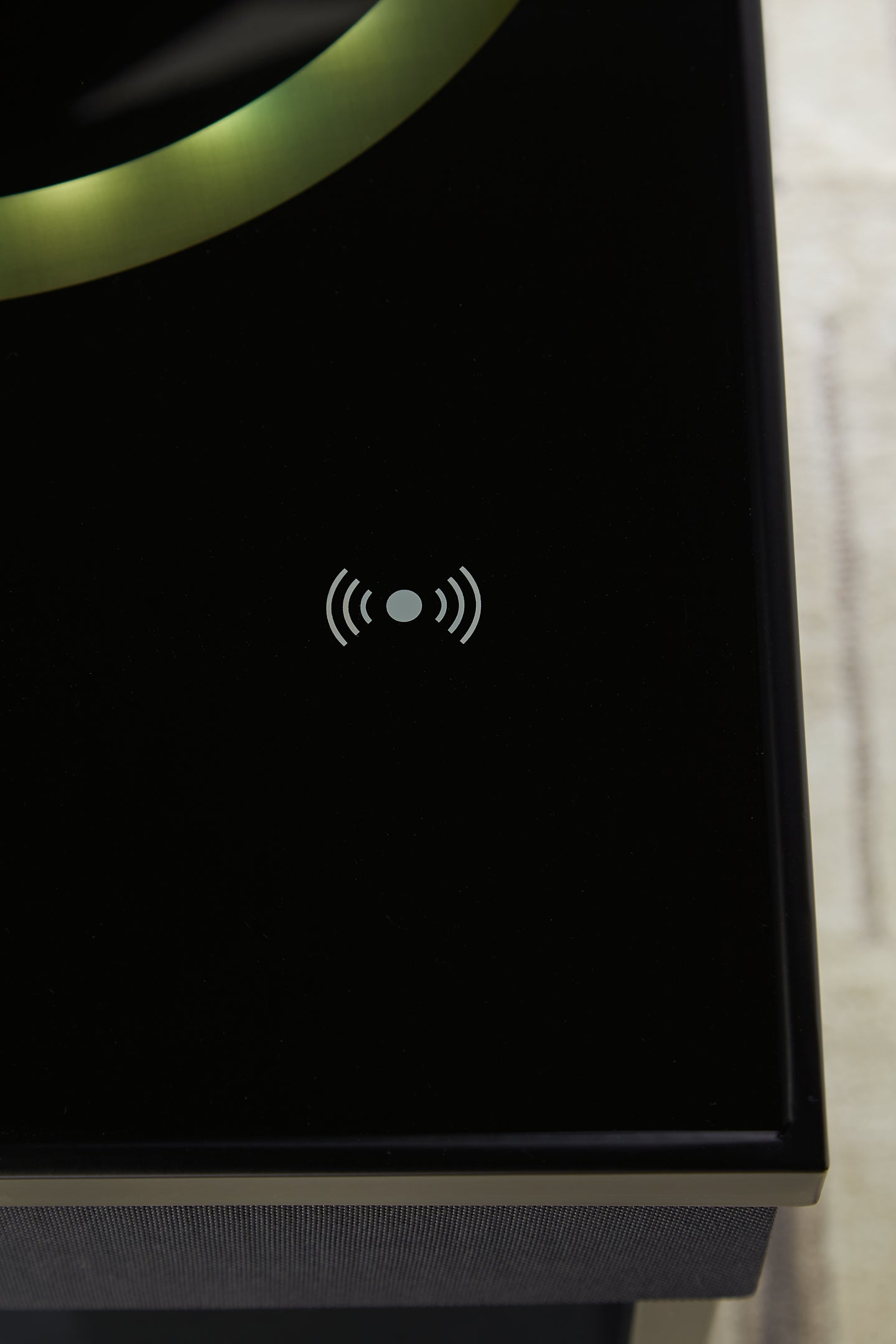 | Details | Made with engineered wood, glass and metal, Metal frame with black finish, Polyester fabric in black, Fixed lower shelf, Glass tabletop with wireless charging and touch-button controls, Two 3" full-range speakers; two 1" tweeter speakers; 5.25” subwoofer, Wireless connectivity; aux audio input; MP3 port, USB-A and USB-C charging ports, LED light effect on top, Power cord included; UL Listed | |