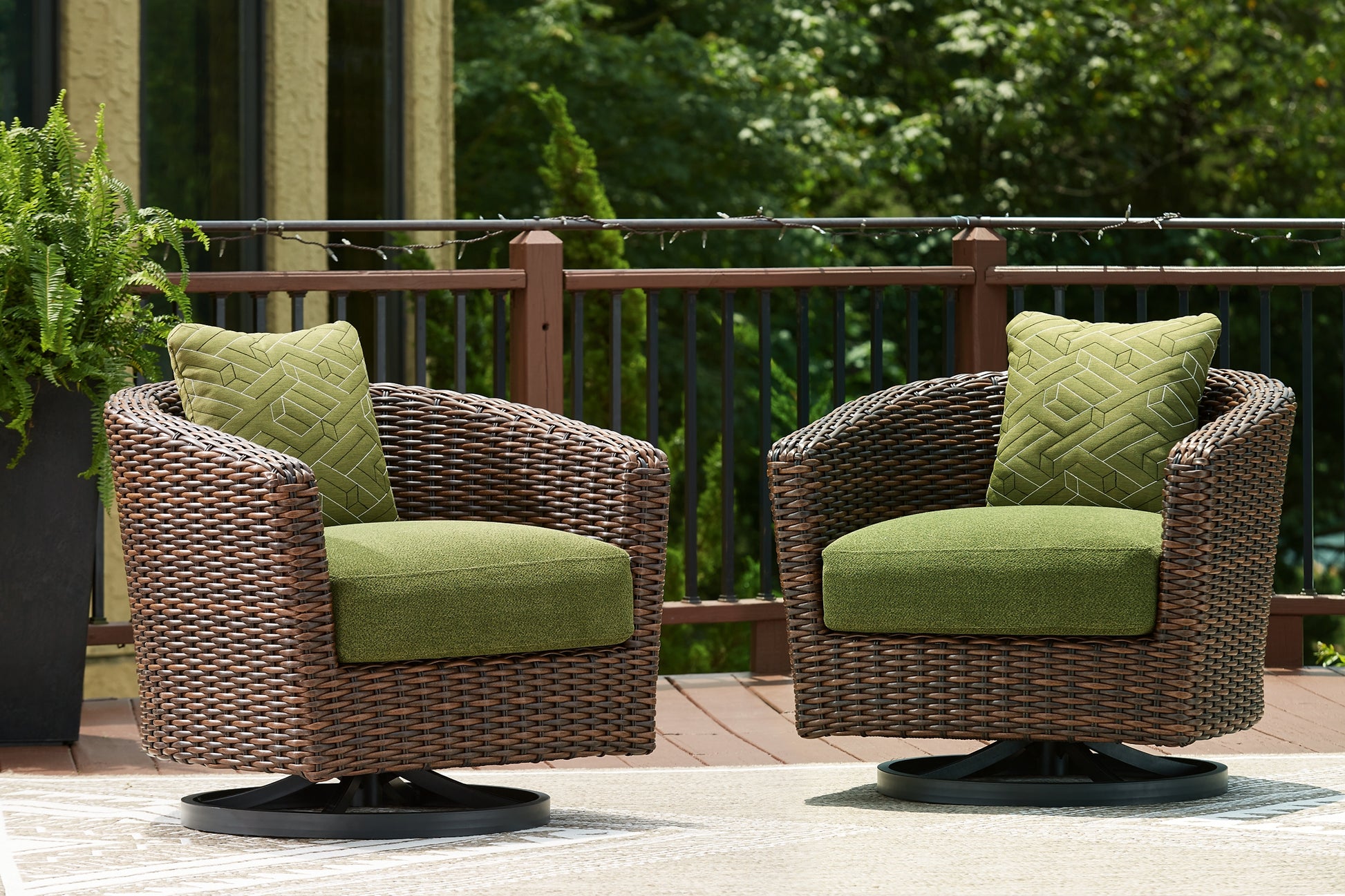 This outdoor swivel lounge chair recalls the aesthetics of nature to bring an inviting, high-style feel to your patio or lanai. Its Nuvella+™ performance fabric is made with enhanced UV resistance, so the chic green hue stays brighter for longer. Worried about the weather? Don't sweat it—the durable resin wicker withstands the elements from season to season.