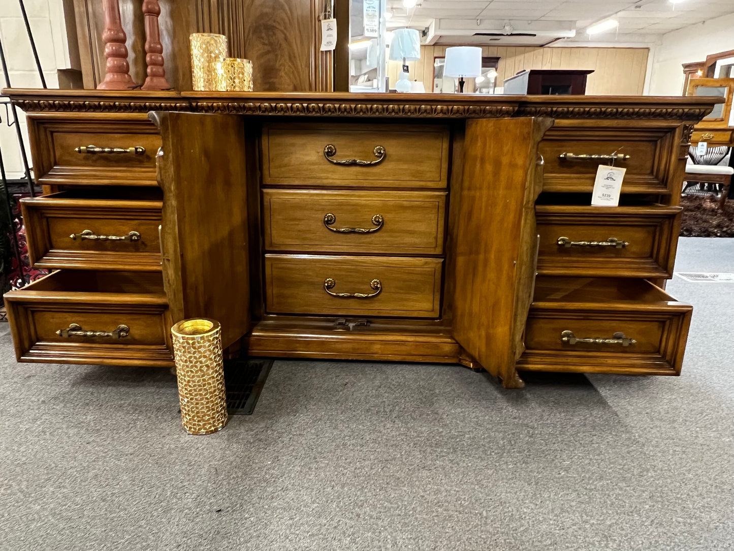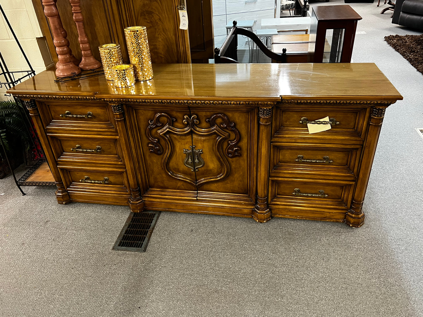 Take in this enormous beautifully sculpted dresser by Romweber. At just under 80" wide this exquisite furniture will solve your storage needs. At an insanely low price of $239 it won't last long. And don't forget about the gorgeous mirror that's included!